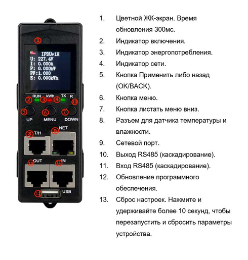 Цветной LCD дисплей для отображения всех ключевых параметров, установка без инструментов (Zero U), съемные модули для легкой замены и обслуживания, возможность каскадирования до 10 устройств для централизованного управления.