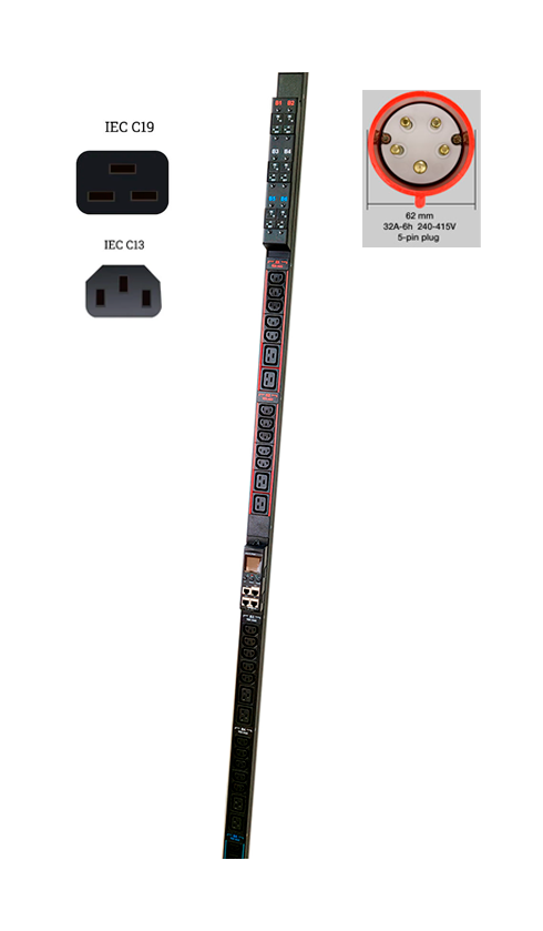 Блок розеток интеллектуальный БРП-И мониторинг по фазам, представляет собой 6-ти контурную группу из 30 розеток С13, 6 розеток С19, с 6-ю гидравлическими электромагнитными выключателями, кабель питания питания 2-3 метра (не поддерживающий горение -LS, -HF) с вилкой IEC 60309, собранных в алюминиевый корпус. Внешний корпус изготовлен из цельнотянутого алюминиевого профиля с продольными ребрами жесткости, который в дальнейшем проходит защитное порошковое полимерное покрытие по ГОСТ. Сами же корпуса силовых розеток С13, С19 изготавливаются из нетоксичного и негорючего пластика. Все токоведущие детали электрических розеток (шины контактов и заземляющие элементы) выполнены из медных сплавов.