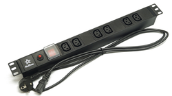 Блок розеток 19", 1U, 8 розеток IEC 60320 C13, индикатор напряжения, однофазный 10A, вход питания IEC 60320 C14. RS19-8C13-I-C