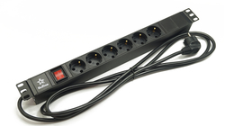 Блок розеток 19", 1U, 6 розеток Schuko, выключатель с подсветкой, однофазный 16A, кабель питания 2 метра. RS19-6SH-S-16-2EU