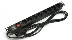 Блок розеток 19", 1U, 9 розеток Schuko, выключатель с подсветкой, однофазный 16A, кабель питания 2.5 метра с вилкой C20. RS19-9SH-S-16-2.5IEC