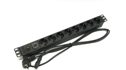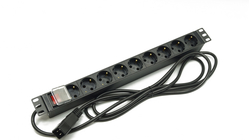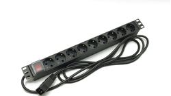 Блок розеток 19", 1U, 9 розеток Schuko, однофазный 10A, кабель питания 2.5 метра IEC 320 C14. RS19-9SH-10-2.5IEC