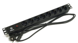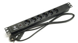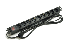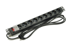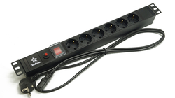 Блок розеток 19", 1U, 9 розеток Schuko, выключатель с подсветкой, однофазный 10A, кабель питания 2.5 метра с вилкой IEC 320 C14. RS19-9SH-S-10-2.5IEC
