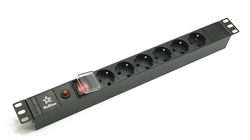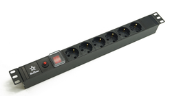 Блок розеток 19", 1U, 6 розеток Schuko, выключатель с подсветкой, функция защиты от перегрузки, однофазный 10A, вход питания IEC 60320 C14. RS19-6SH-S-M-C