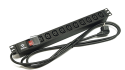Блок розеток 19", 1U, 10 розеток IEC 60320 C13, выключатель с подсветкой, функция защиты от перегрузки, однофазный 10A, кабель питания 2 метра EU-Schuko. RS19-10C13-S-M-16-2EU